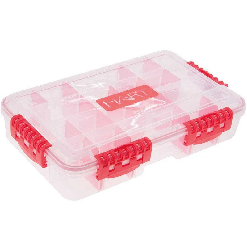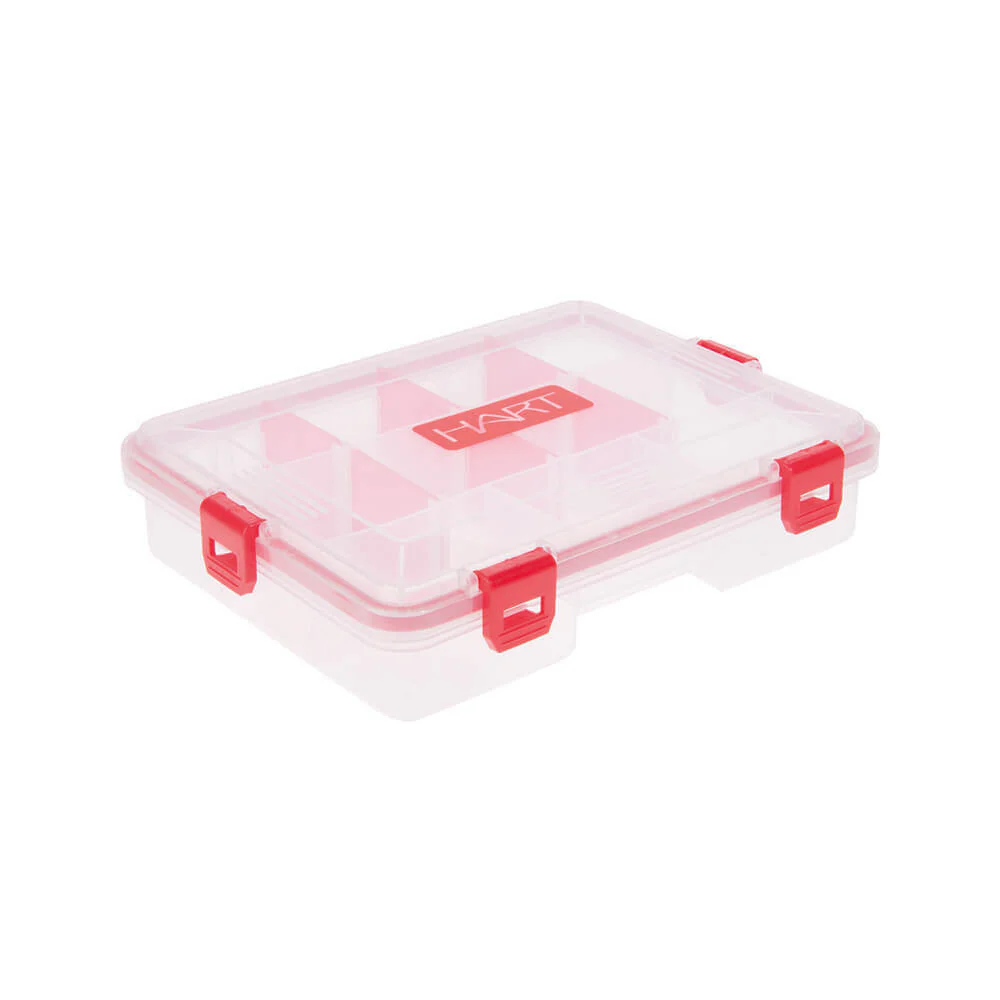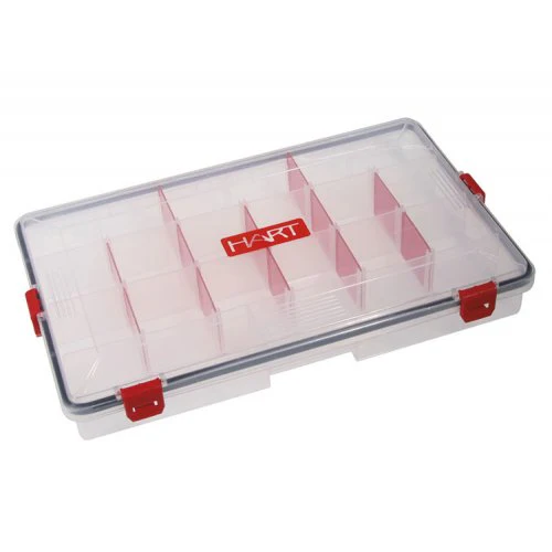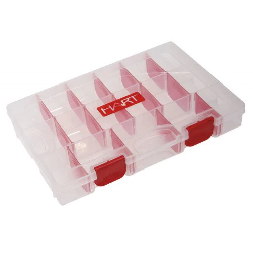 Caja con departamentos móviles para almacenar señuelos. Los separadores de color rojo son independientes y móviles entre las distintas guías para soportar distintos tamaños de señuelo o cantidad. Material compatible con señuelos de vinilo.