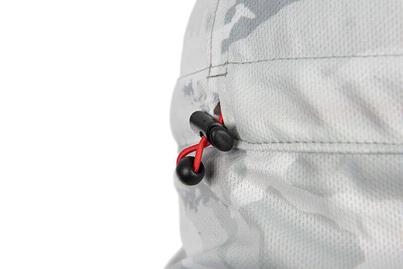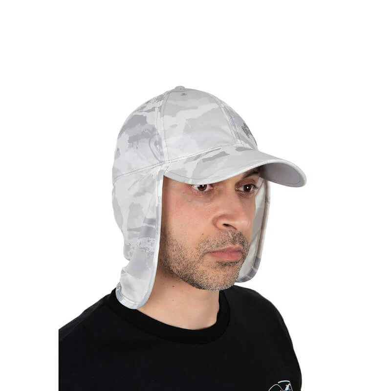 Gorra con orejeras de la marca Fox Rage diseño camuflaje en color gris claro con logo, es ideal para la modalidad de Black-Bass, para los meses de verano o para su uso urbano.