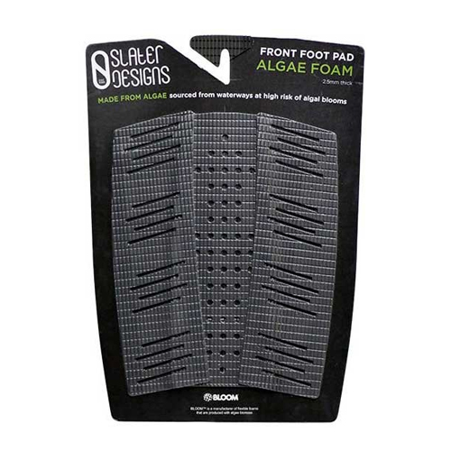 El grip de surf Slater Designs Front Foot Pad esta hecho con espuma ecológica fabricada a base de algae. El algae es una planta que crece demasiado e impide la buena circulación del agua. Kelly Slater quería usar este material para contribuir en equilibrar esos ecosistemas. Hasta el embalaje es ecológico y biodegradable.