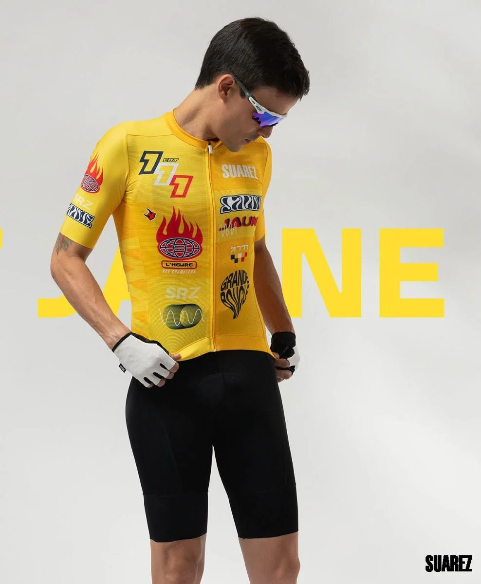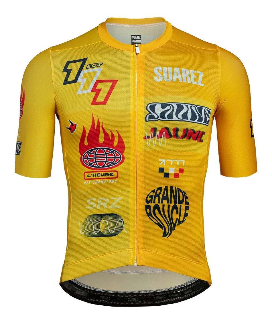 Esta camiseta está inspirada en el líder de la clasificación general individual, el color amarillo es un homenaje a las páginas del diario L’Auto (lo que se conoce actualmente como L’Equipe) Este color vibrante que simboliza optimismo y energía ha estado presente en el Tour de Francia desde 1919, por lo tanto, buscamos la forma de tenerlo presente en nuestra edición jugando con las vibraciones del color en sus diferentes tonalidades. Llevándonos ha ese momento donde por primera vez Colombia