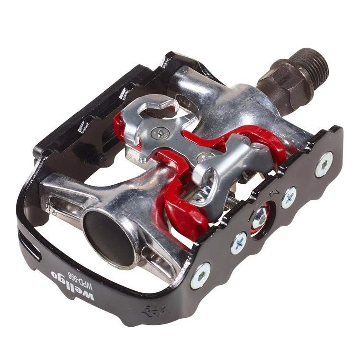 - Pedal de aluminio con jaula de aluminio negro, sistema de clic en un lado, pata de oso en un lado.