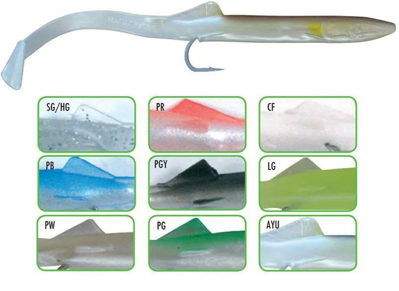El vinilo Ragout Raglou es un señuelo blando que imita la natación de un alevín en huida y es un bocado muy apetitoso para lubinas, jureles y pequeños túnidos, tanto a spinning con bombeta como a curricán costero